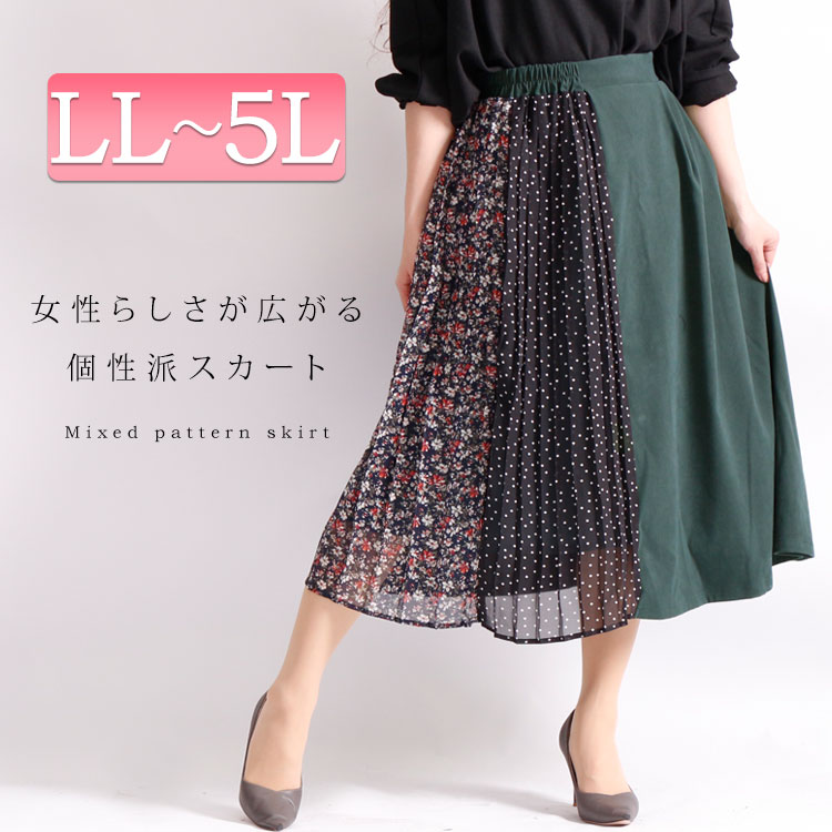 花柄×ドット×無地のコントラストが大人可愛い、異素材切替スカートです。