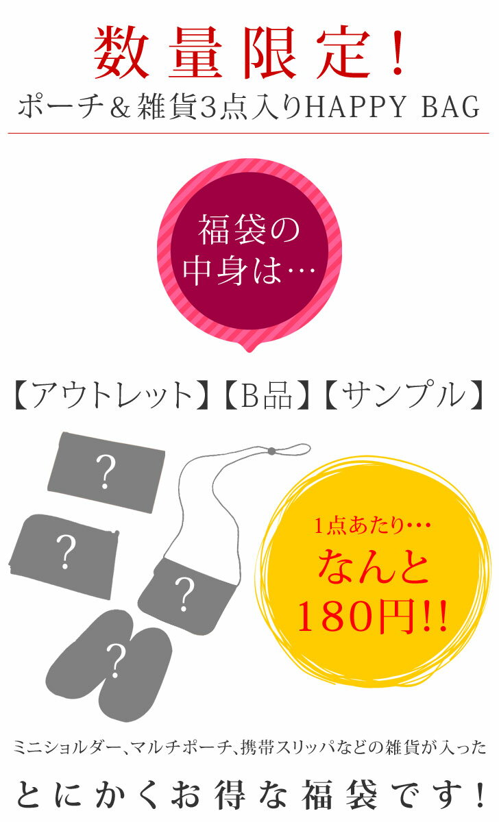 【訳あり】お楽しみグッズ3点入り HAPPY BAG ポーチ マルチポーチ ミニポーチ 携帯スリッパ 折り畳みスリッパ 旅行 トラベル 雑貨 福袋 アウトレットお財布ポシェット お財布 ショルダー